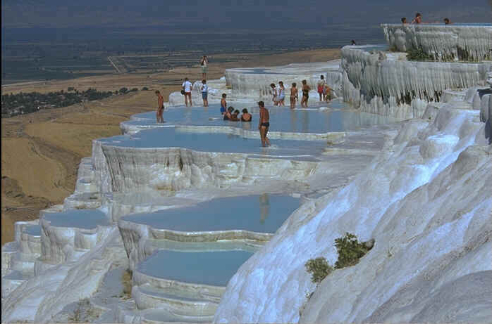 dazzling white, petrified castles. Thermal spring waters laden with calcareous salts